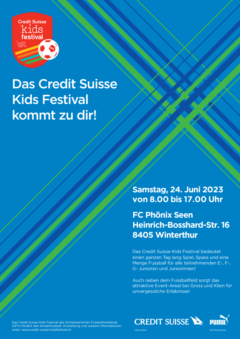 Der Countdown läuft! In einem Monat wird am 24. Juni 2023 auf dem Sportplatz Steinacker das Credit Suisse Kids Festival stattfinden. Der FC Phönix Seen freut sich in Zusammenarbeit mit dem Credit Suisse Kids Festival für Spiel, Spass und Fussballfreude zu Sorgen. Nicht nur auf dem Fussballfeld, sondern auch daneben werden Gross und Klein eine Menge Fussball-Events erleben dürfen.